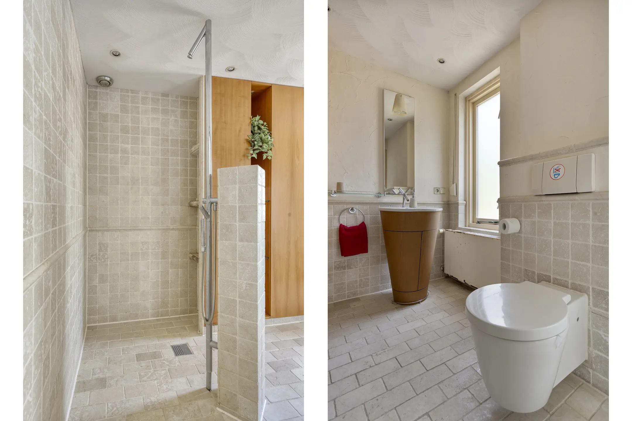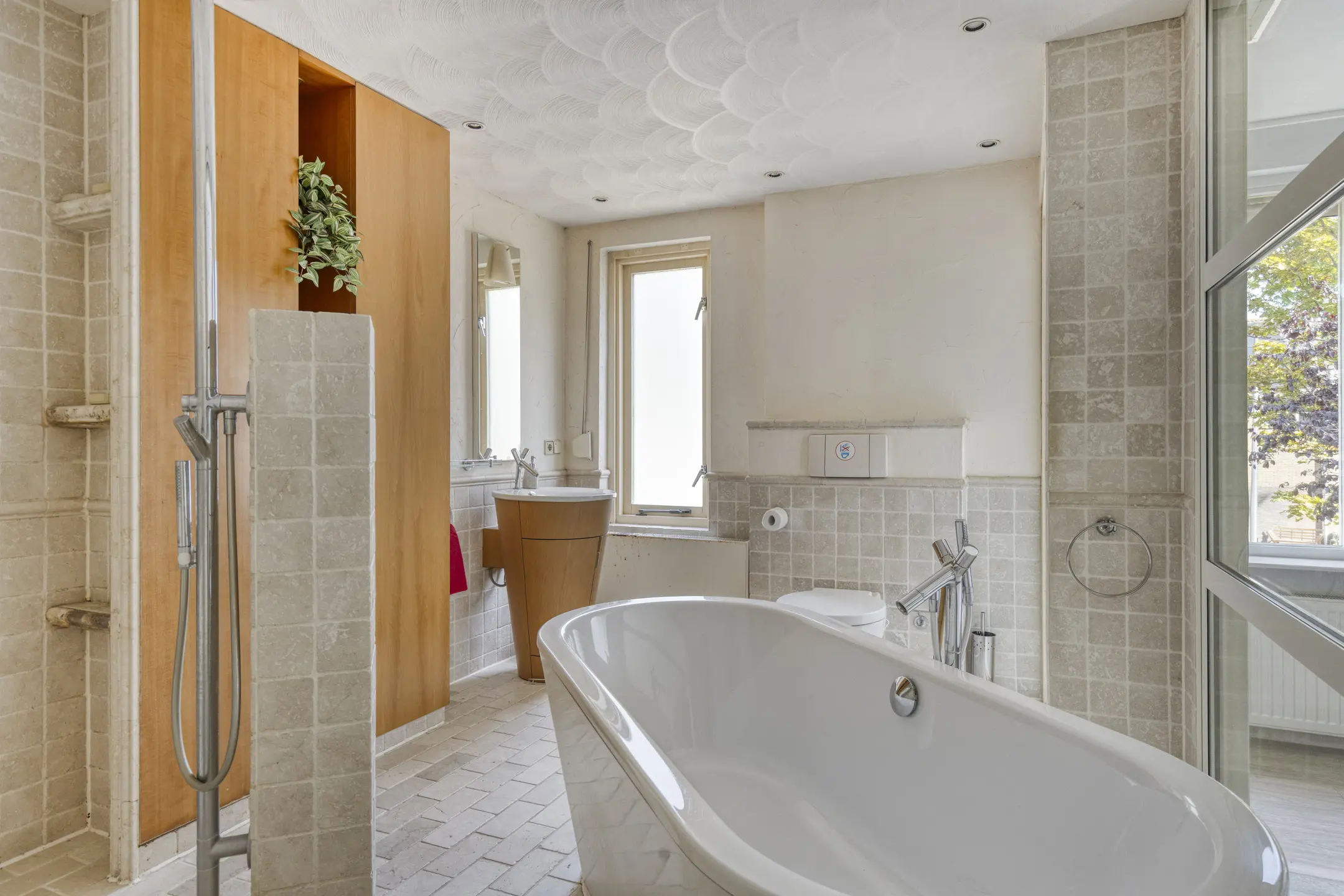 Eerste verdieping: hier vind je een royale slaapkamer aan de achterzijde (voorheen twee kamers), een ruime ouderslaapkamer aan de voorzijde én een luxe badkamer. De badkamer is stijlvol ingericht met sanitair van Philippe Starck (Duravit) en beschikt over een losstaand ligbad, een inloopdouche, een wastafel en toilet. De strak gestuukte wanden en plafonds met inbouwspots maken het geheel helemaal af.