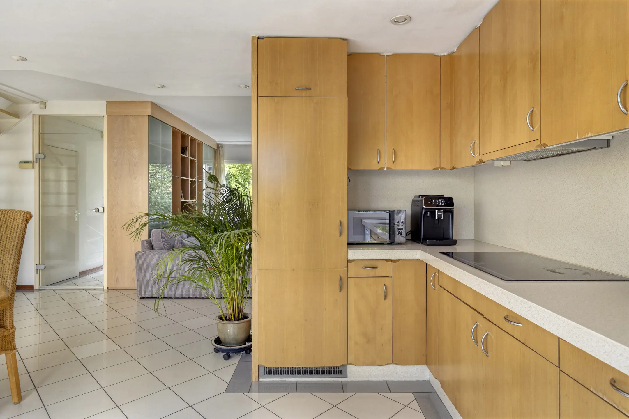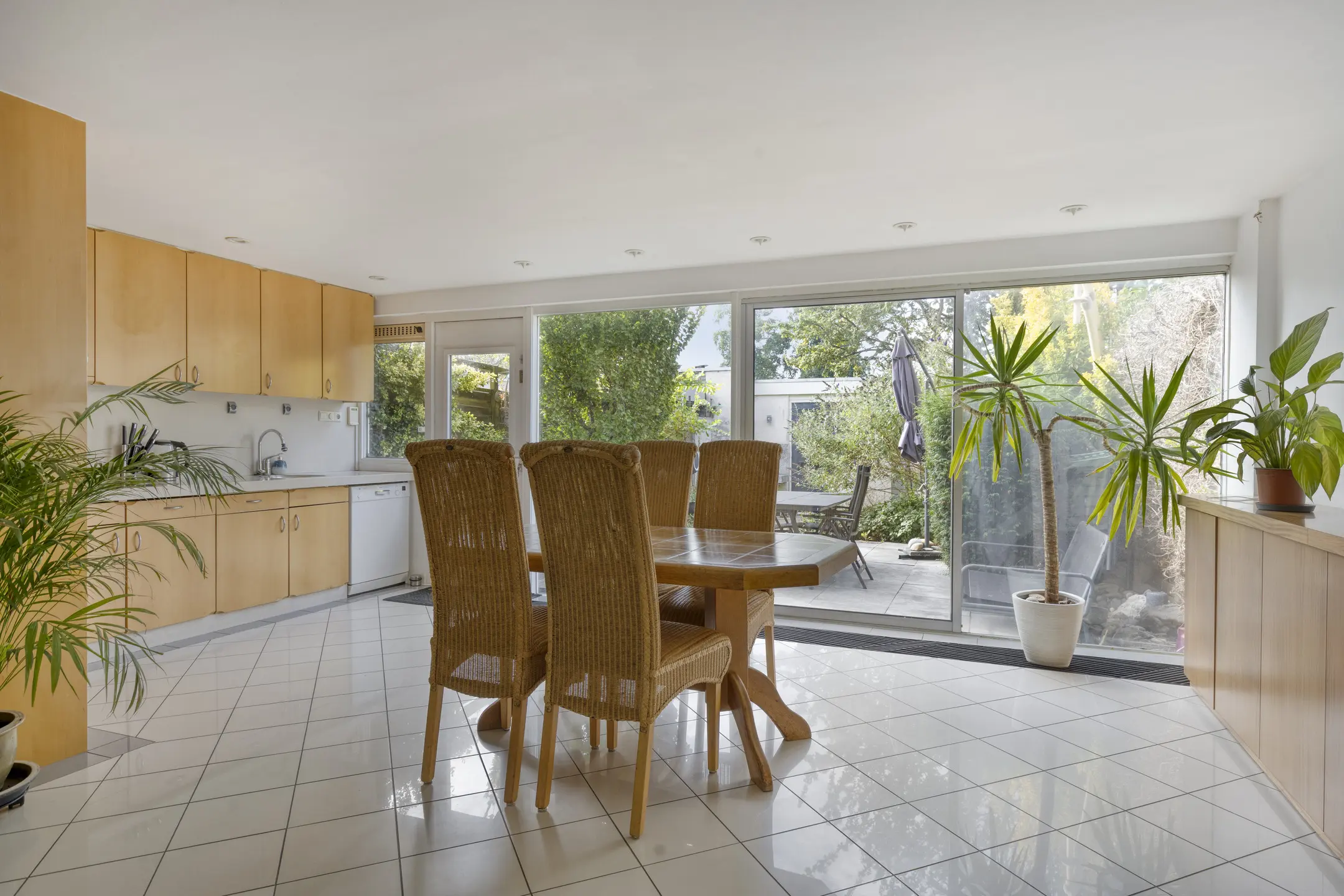 Begane grond: entree met hal, meterkast en toilet. De ruime Z-vormige woonkamer is heerlijk licht dankzij de grote schuifpui naar de tuin. De combinatie van een lichte plavuizen vloer, vloerverwarming en een sfeervolle open haard maakt dit een zeer prettige leefruimte. De open keuken in L-opstelling is voorzien van diverse inbouwapparatuur.
