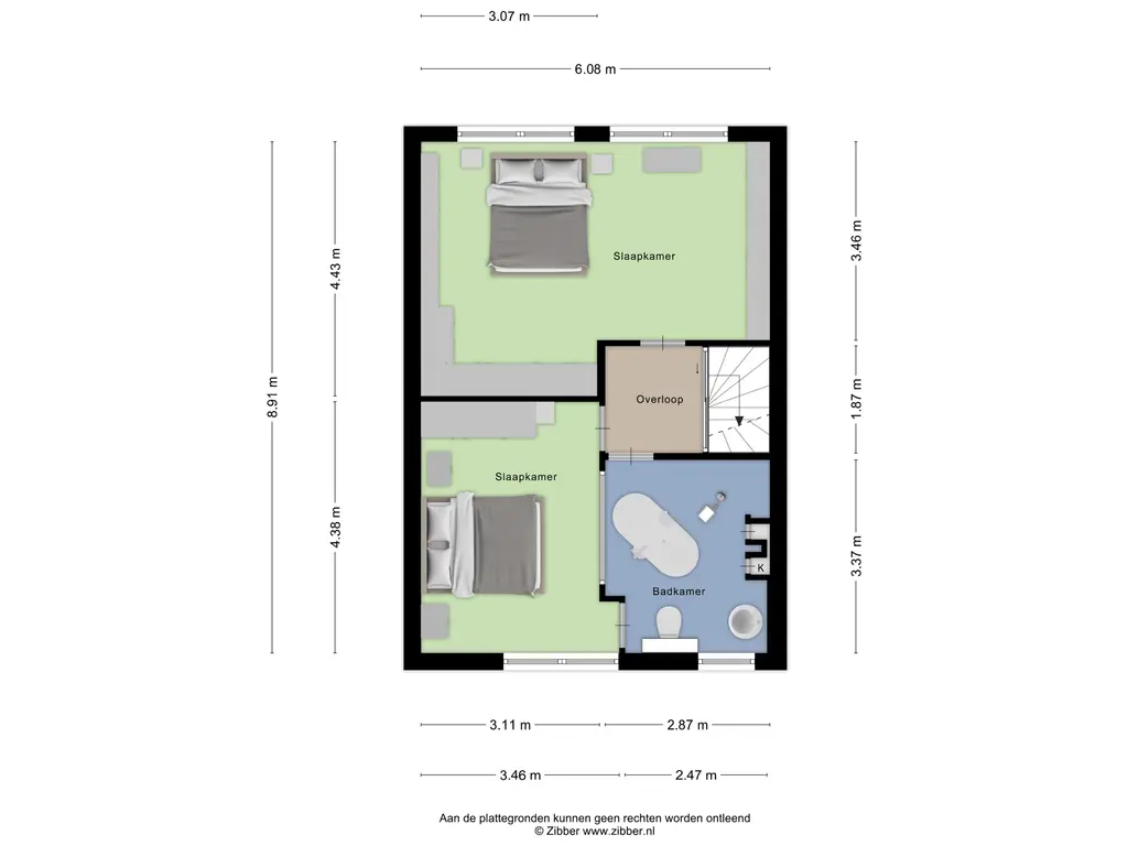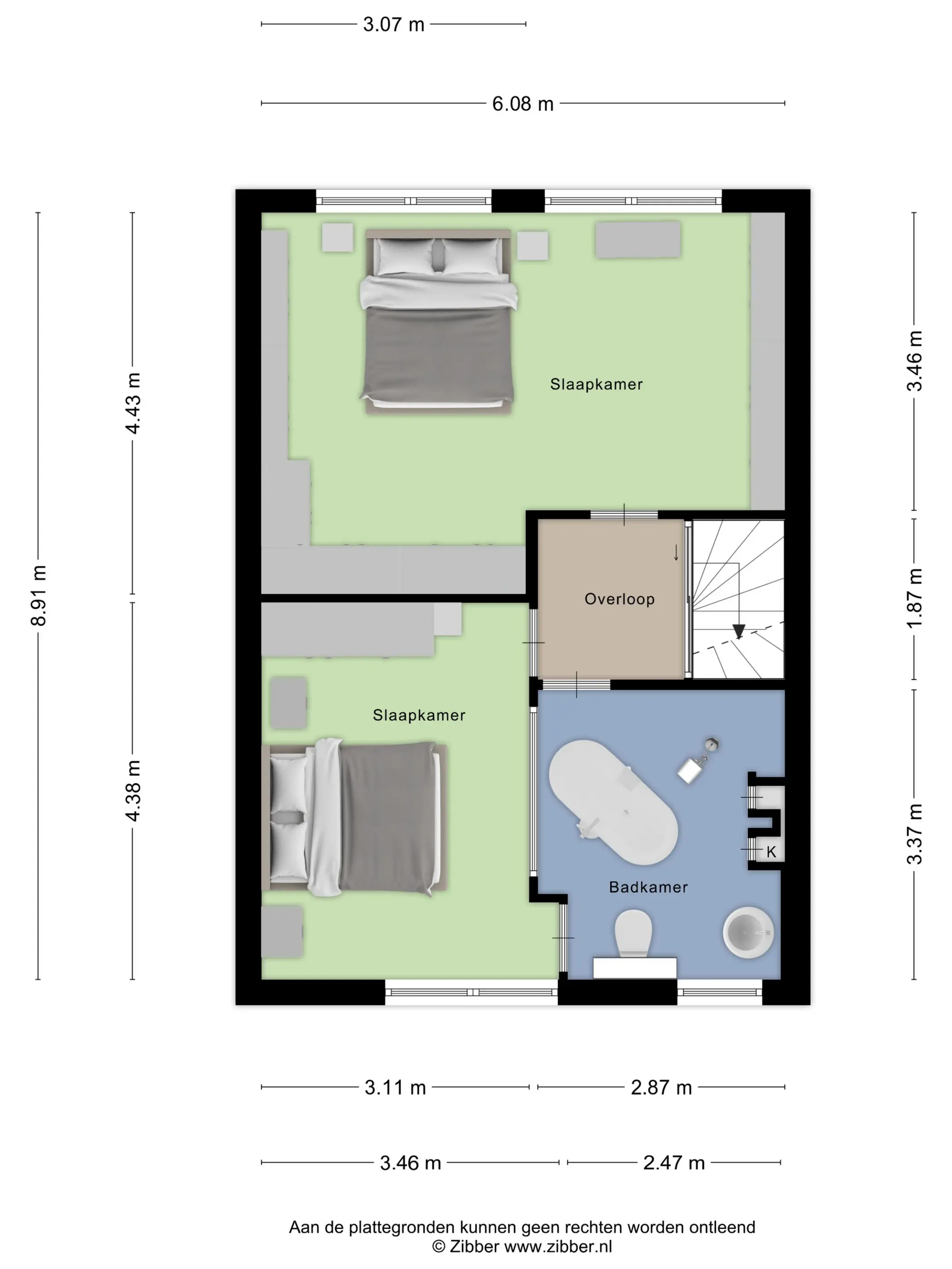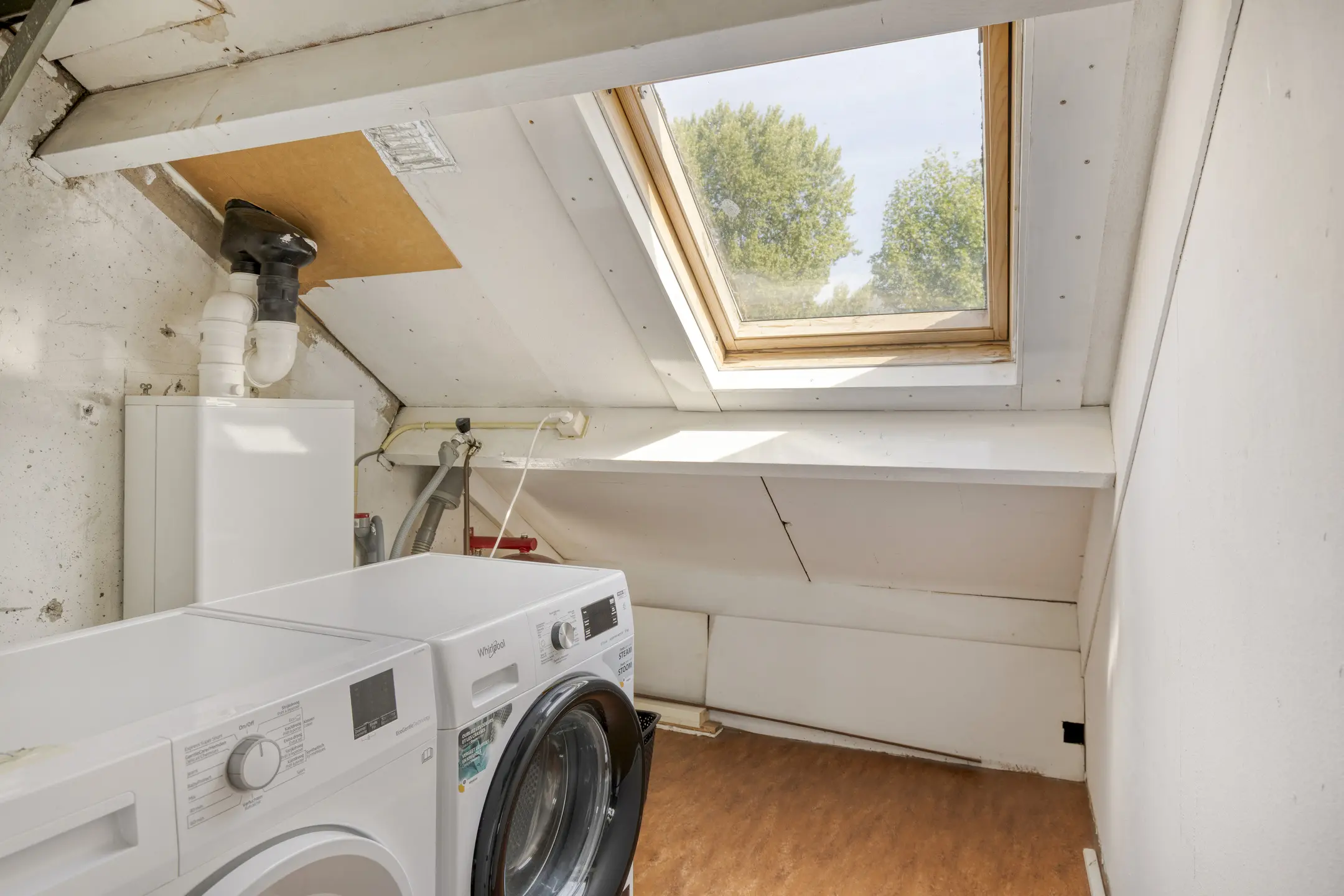 Tweede verdieping: overloop met wasruimte en een grote zolderkamer dankzij een brede dakkapel. Hier kun je met gemak twee extra slaapkamers creëren.