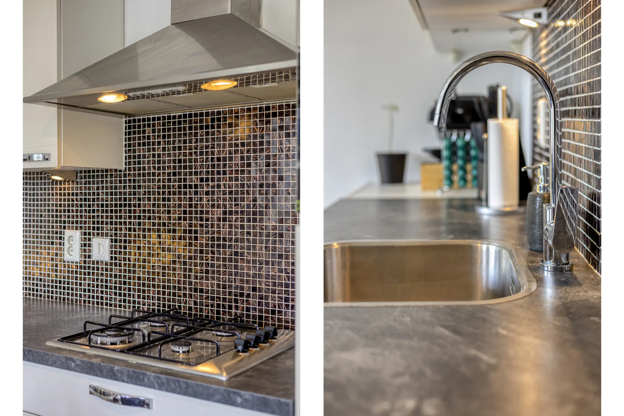 De open keuken sluit naadloos aan op de woonkamer en is modern ingericht met een strakke opstelling en diverse inbouwapparatuur.