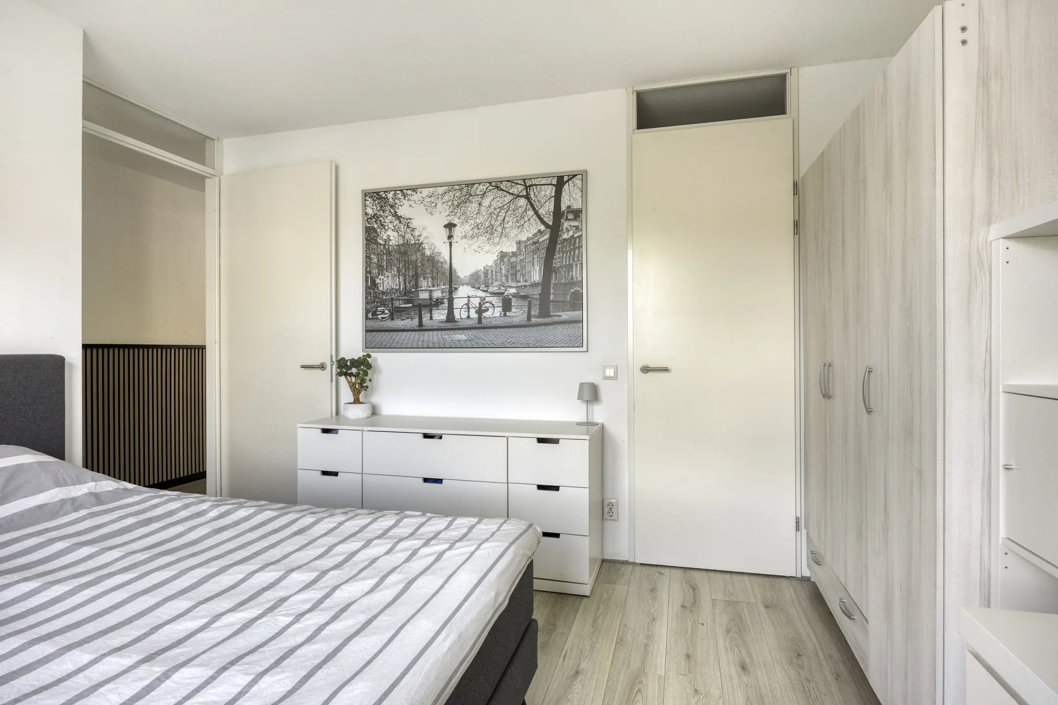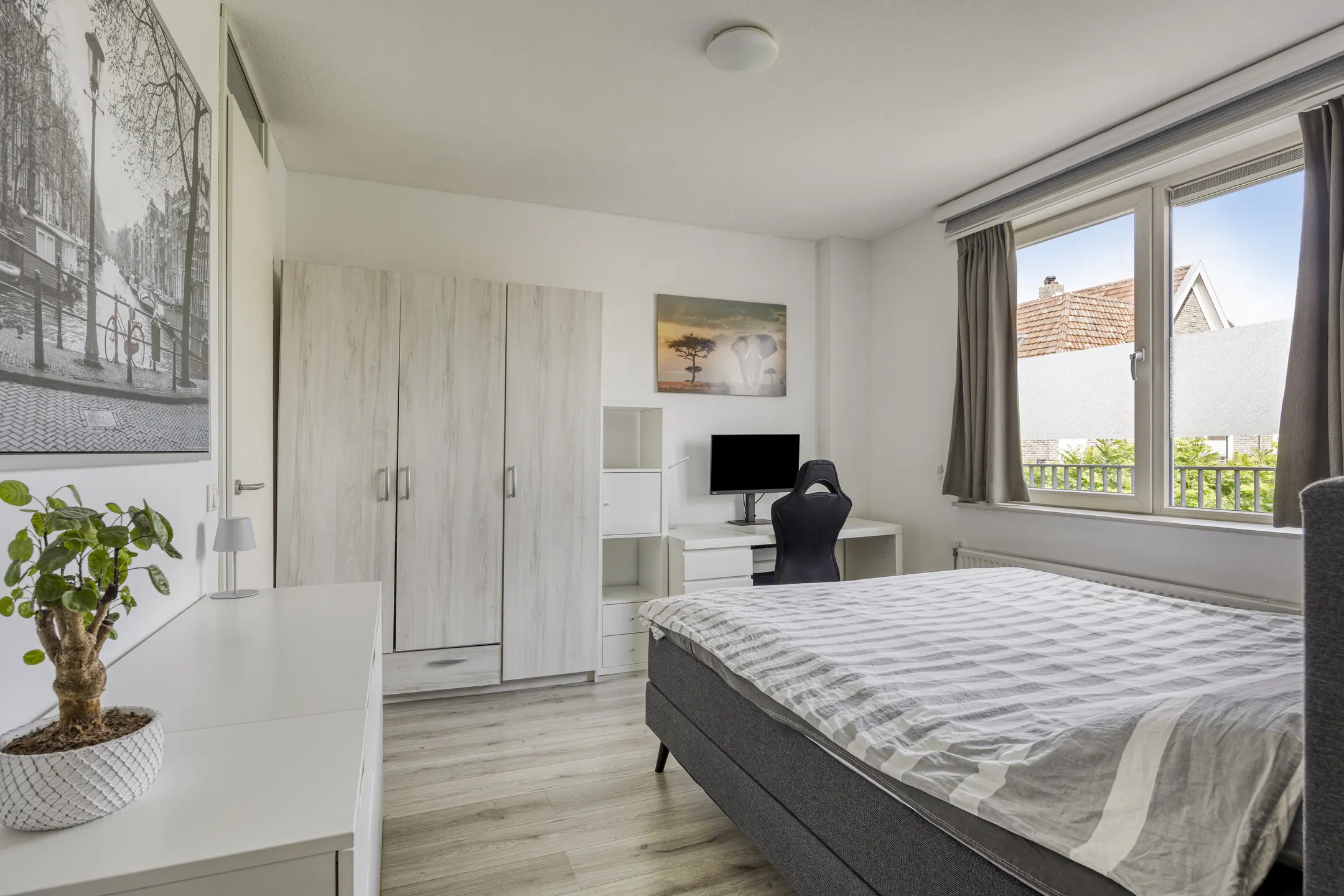 De slaapkamer is ruim opgezet en biedt voldoende plaats voor een tweepersoonsbed en een inloopkast. De badkamer is stijlvol afgewerkt en voorzien van een inloopdouche, wastafelmeubel en toilet.