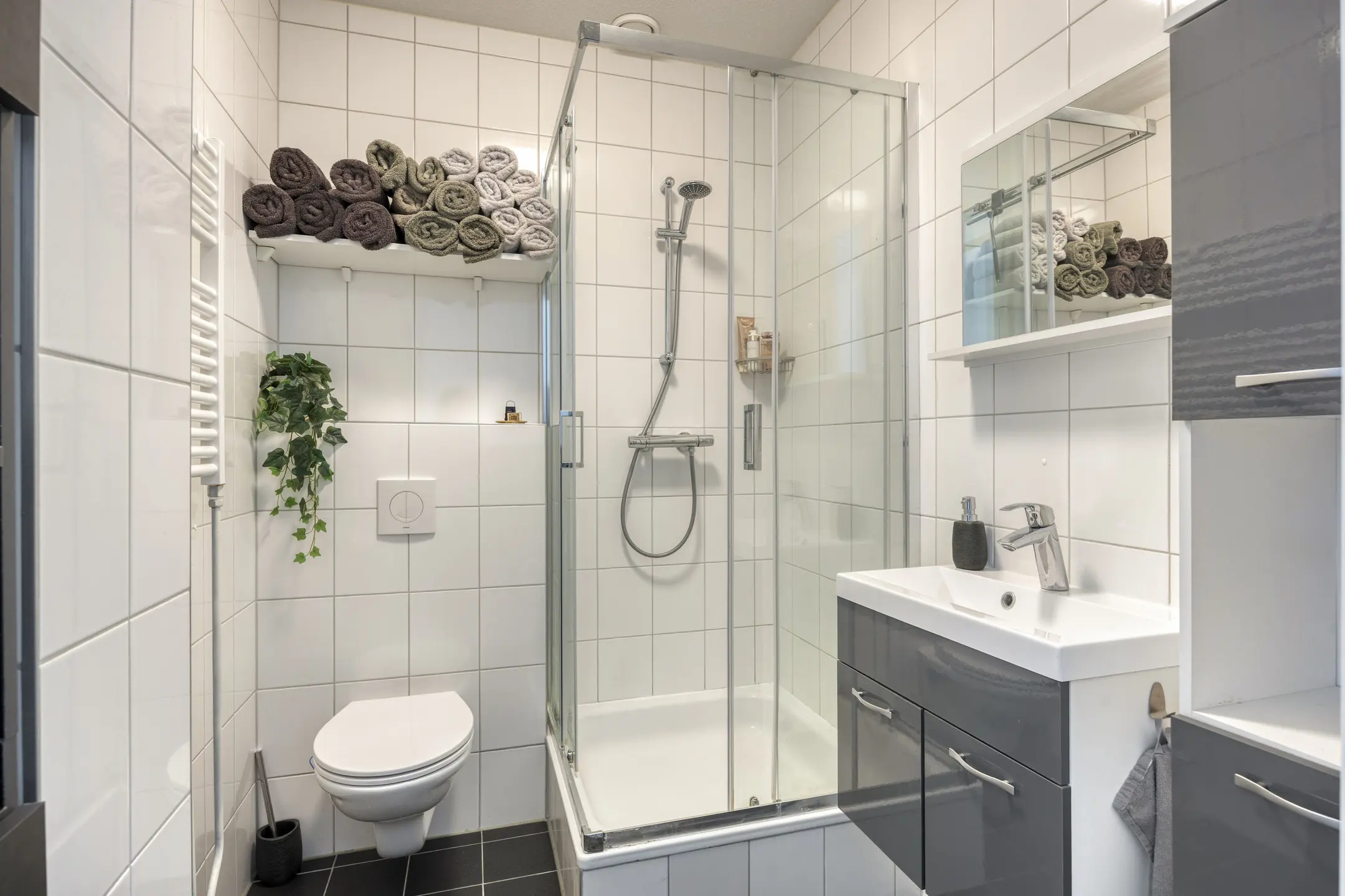 The bedroom is generously sized, with space for a double bed and a walk-in closet. The bathroom is stylishly finished and equipped with a walk-in shower, washbasin cabinet, and toilet.