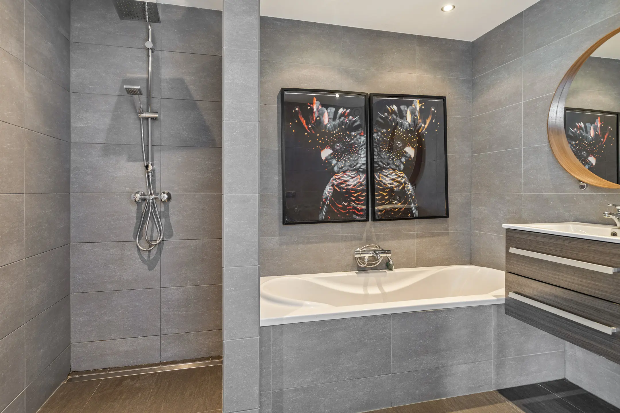 Badkamer met ligbad, inloopdouche, wastafel en tweede toilet