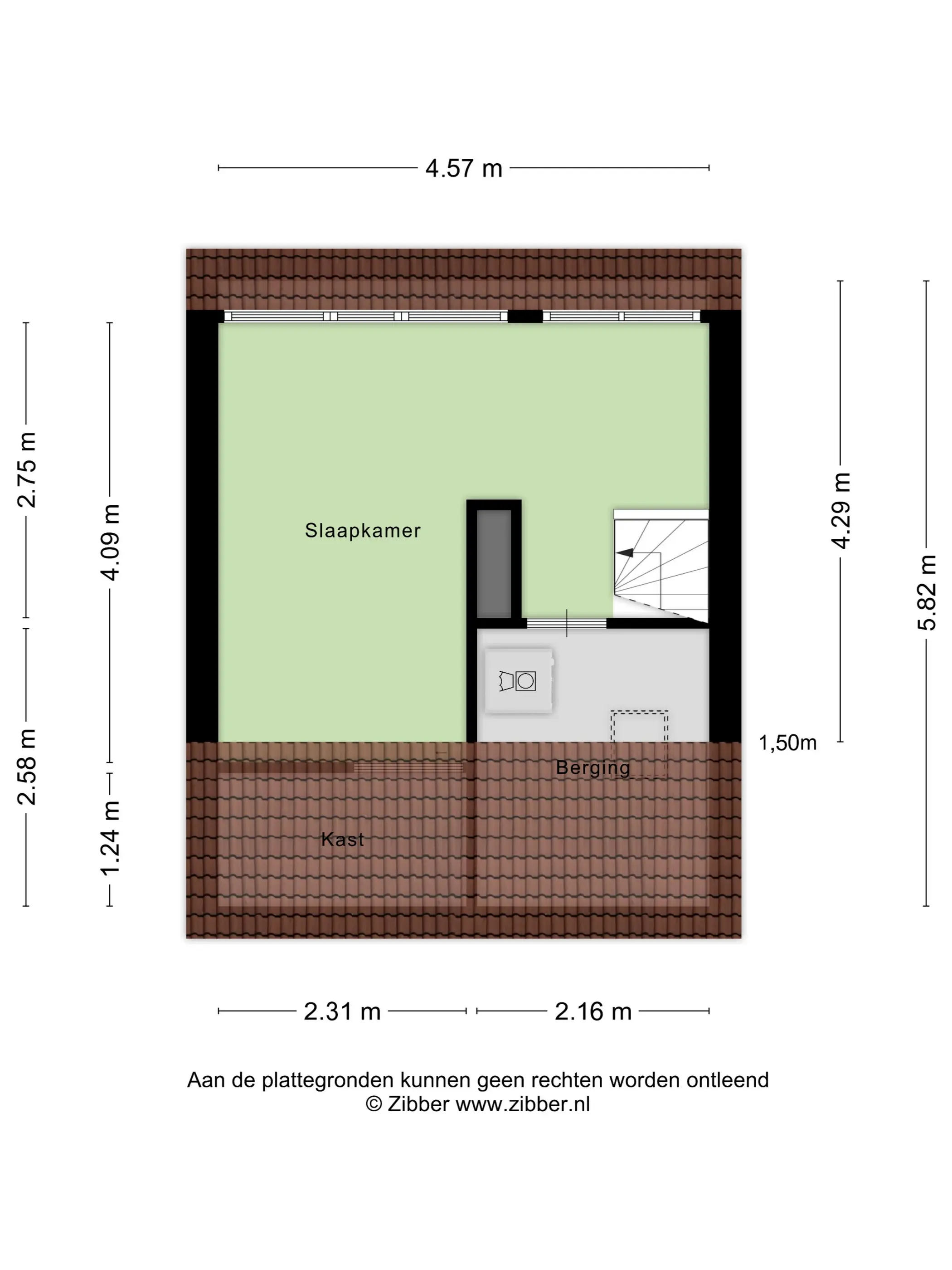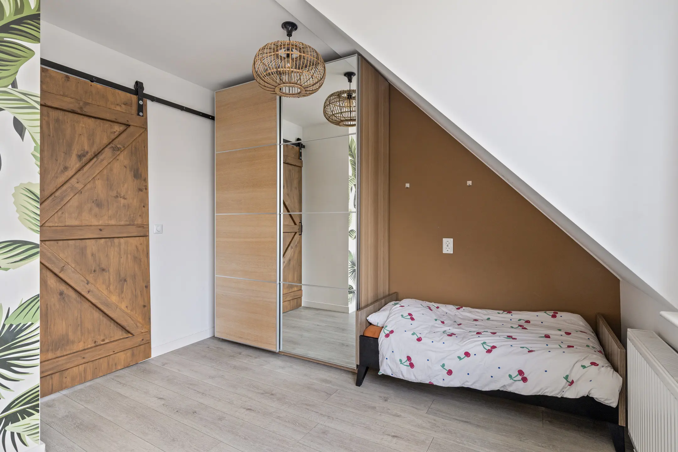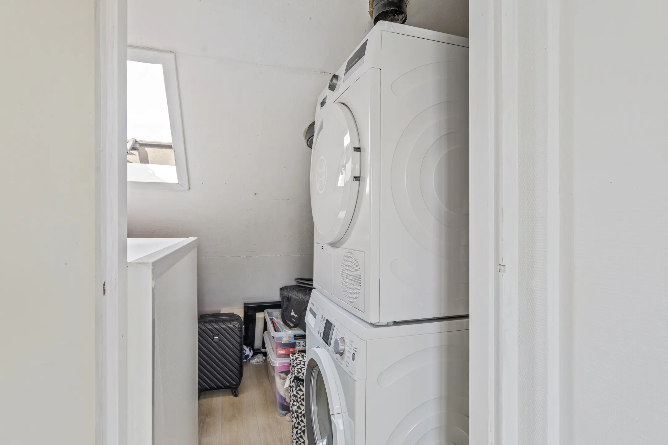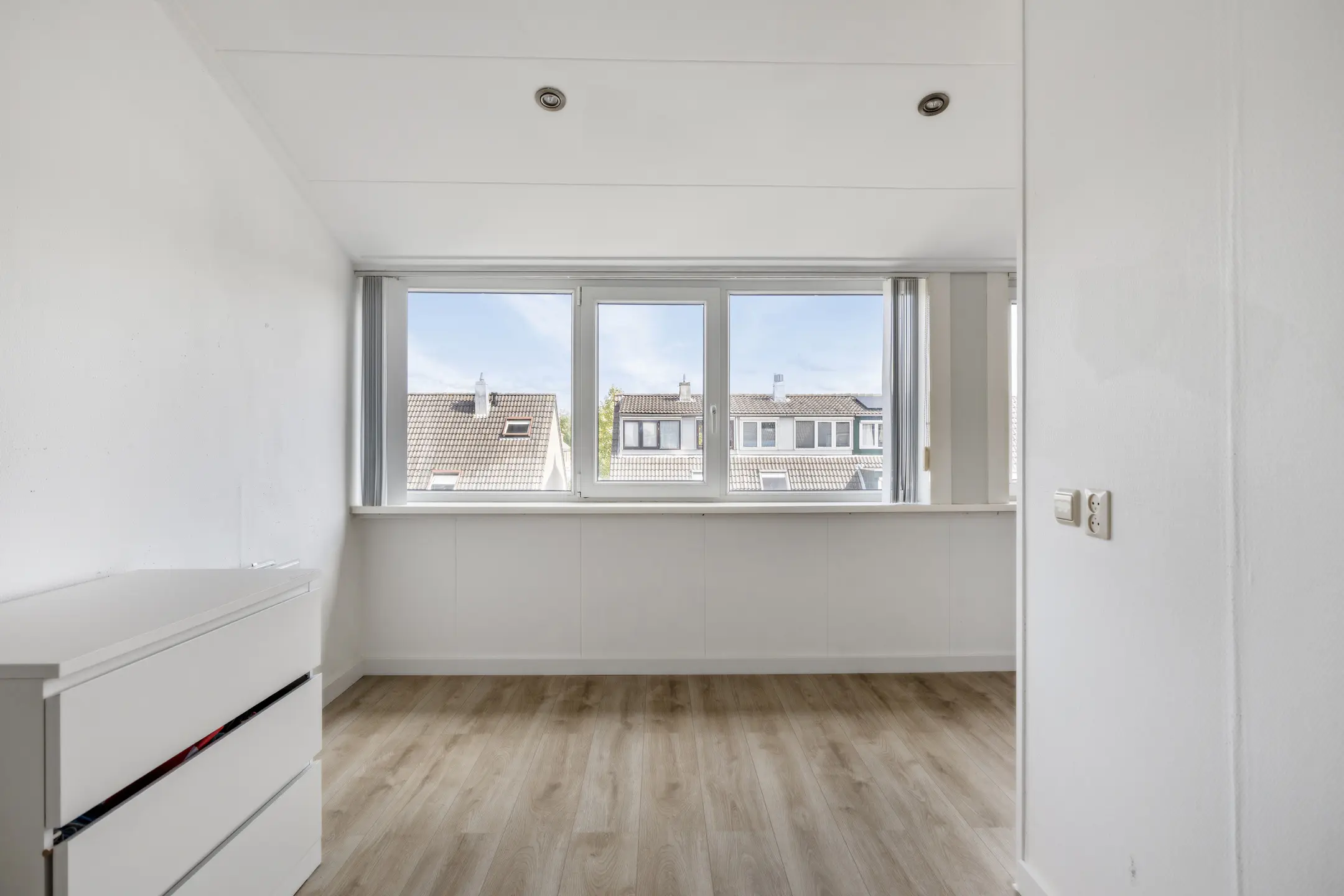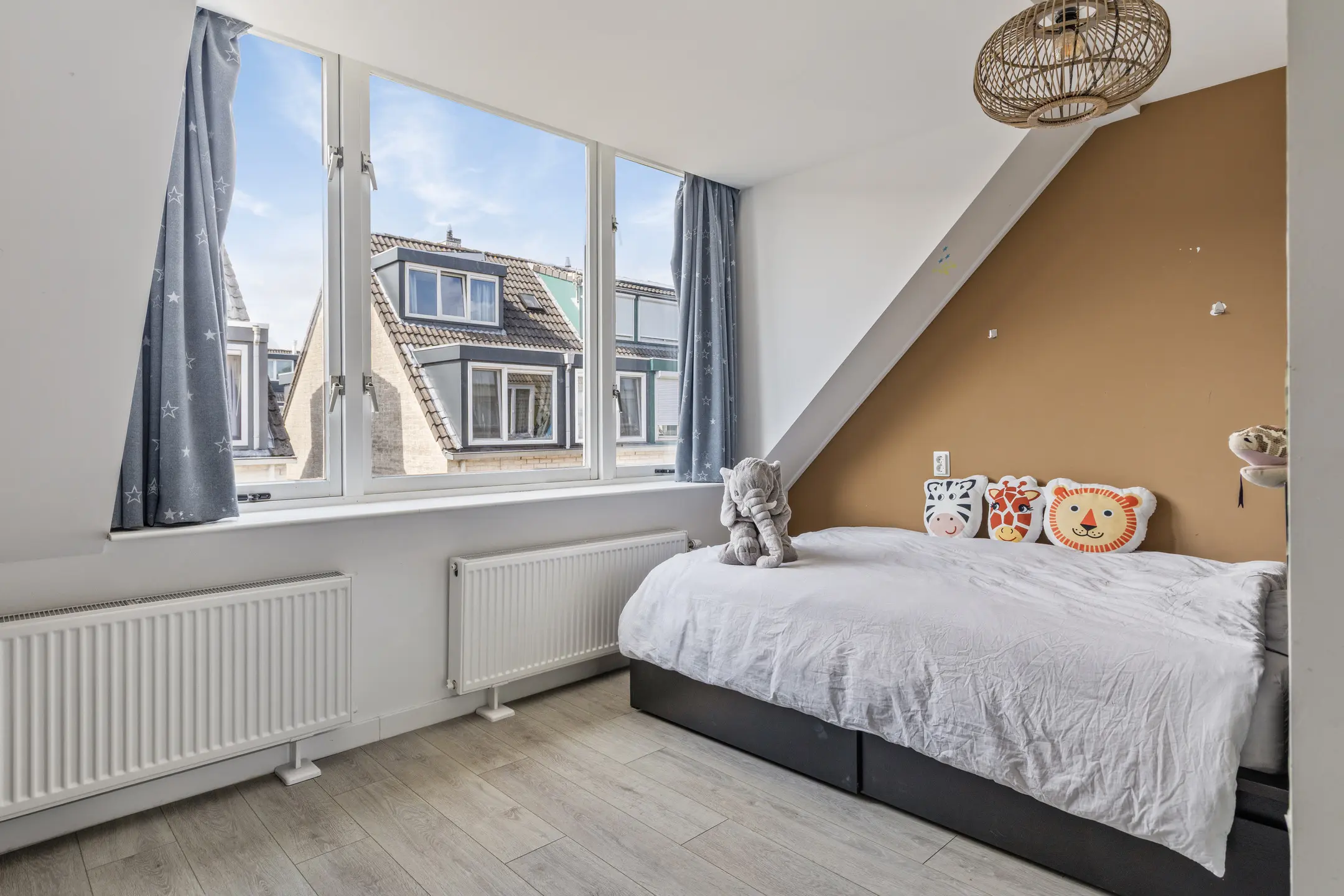 De tweede verdieping herbergt de derde slaapkamer, voorzien van een dakkapel waardoor er veel licht naar binnen valt. Daarnaast is er volop bergruimte achter de knieschotten. Op deze verdieping bevindt zich ook de aparte wasruimte met aansluiting voor wasmachine en droger.