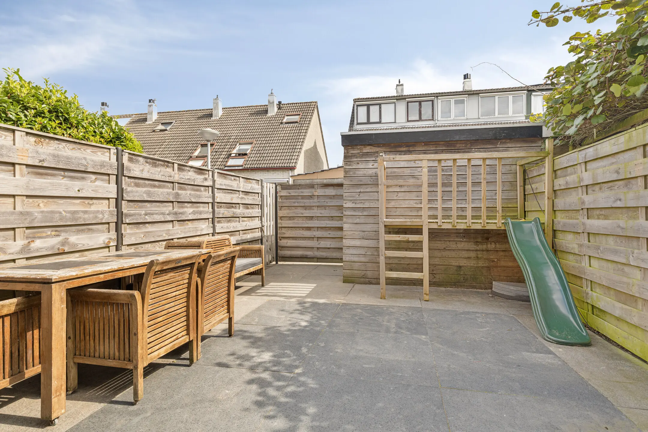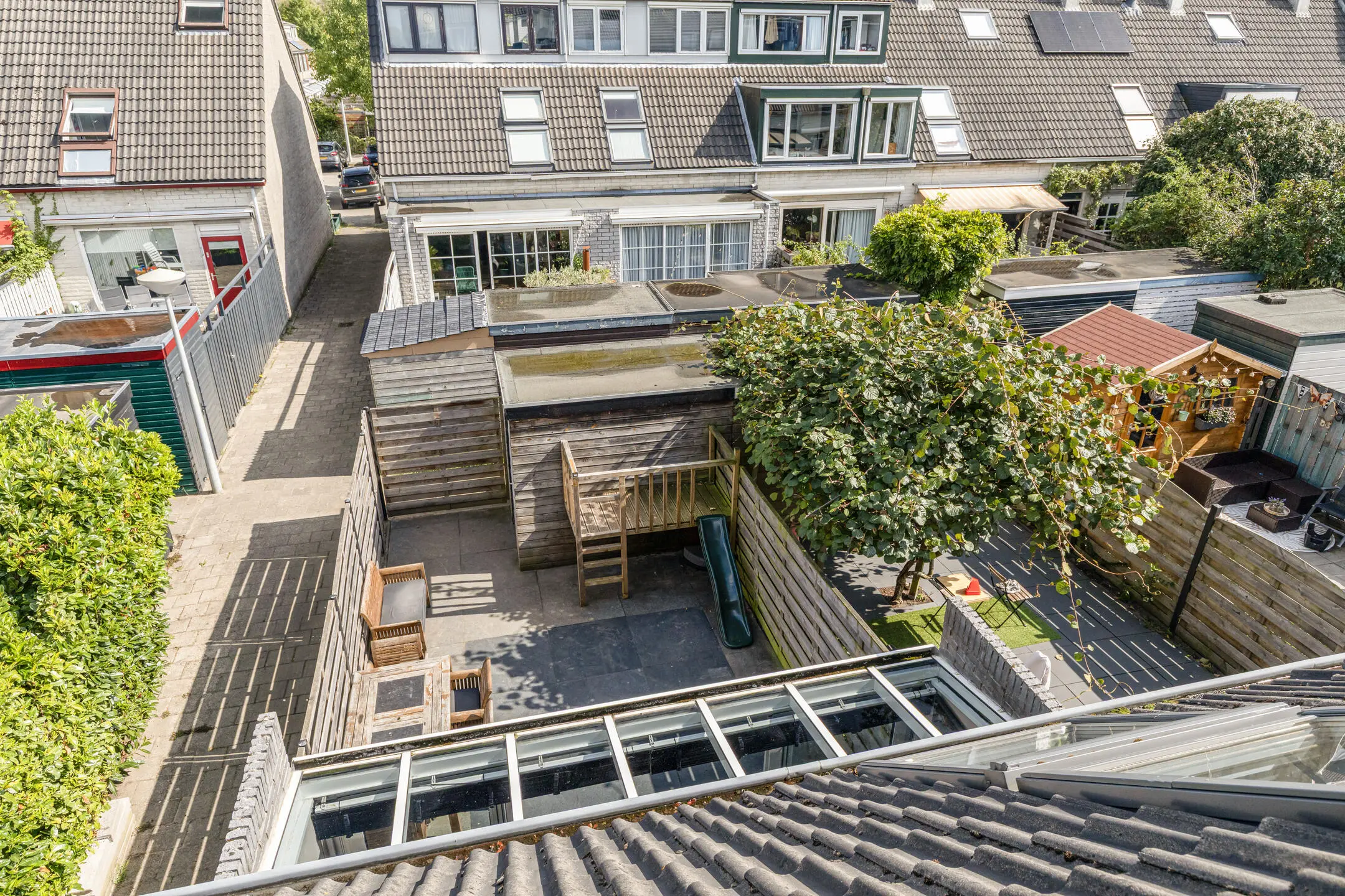 Zonnige westtuin met berging en achterom