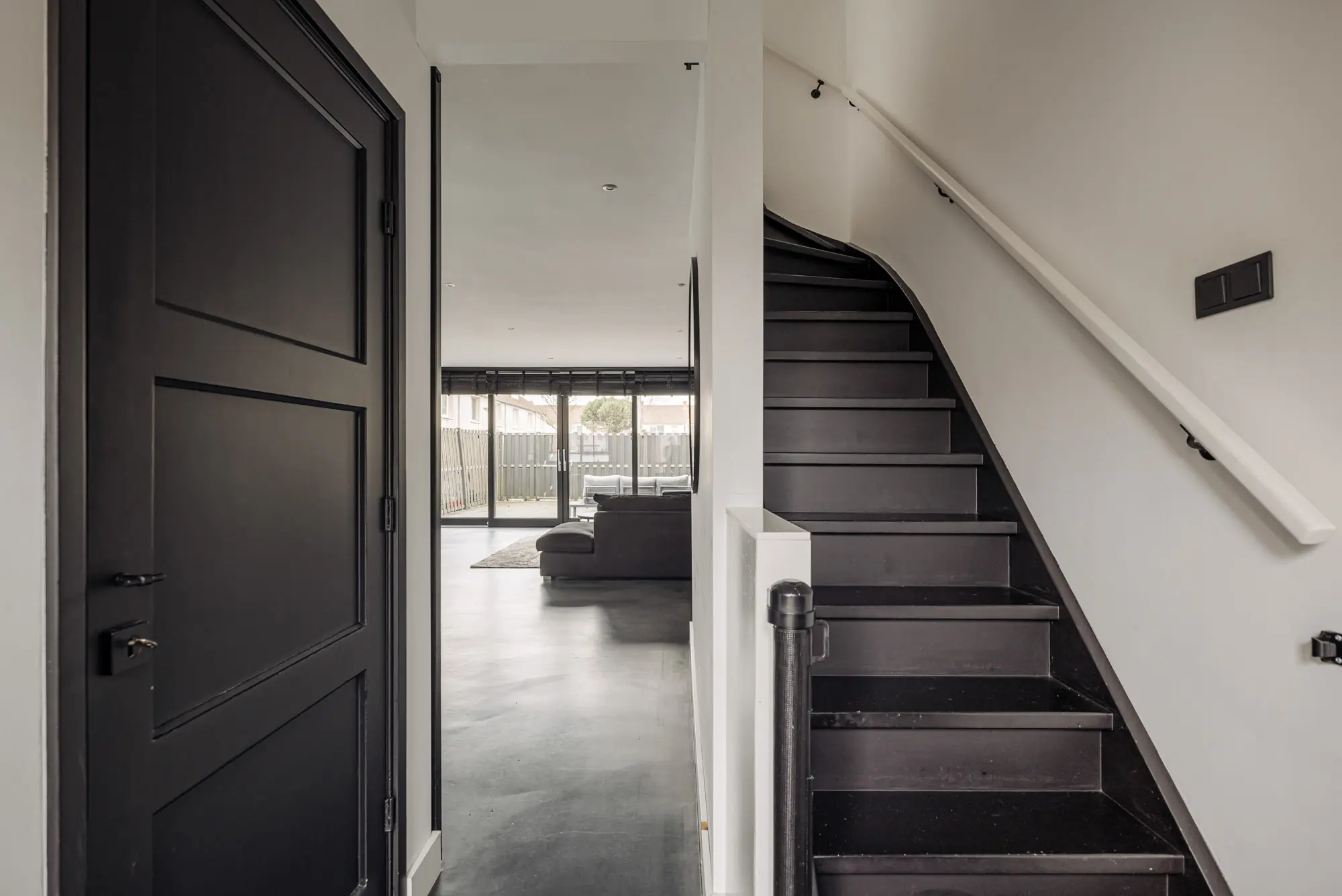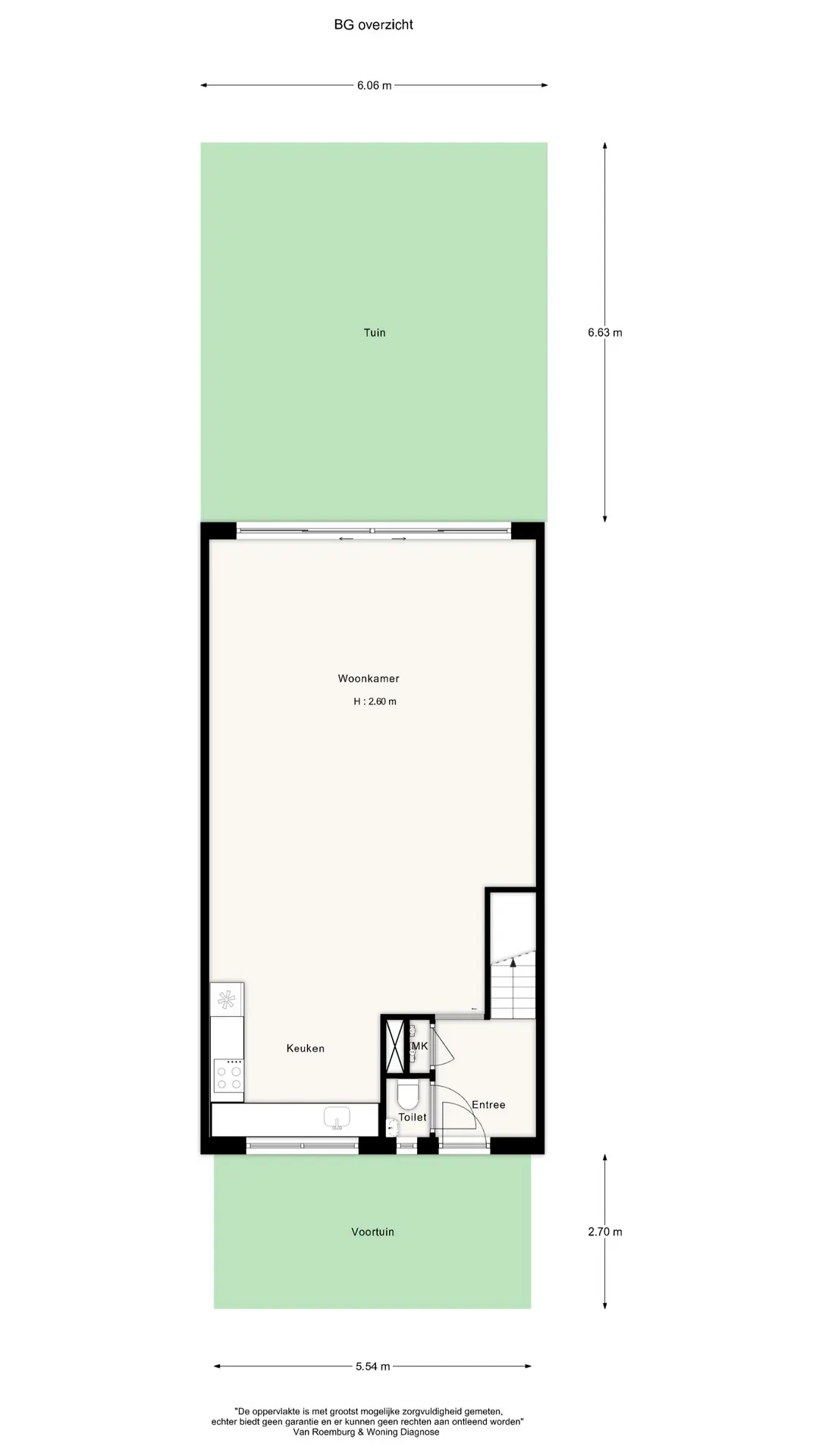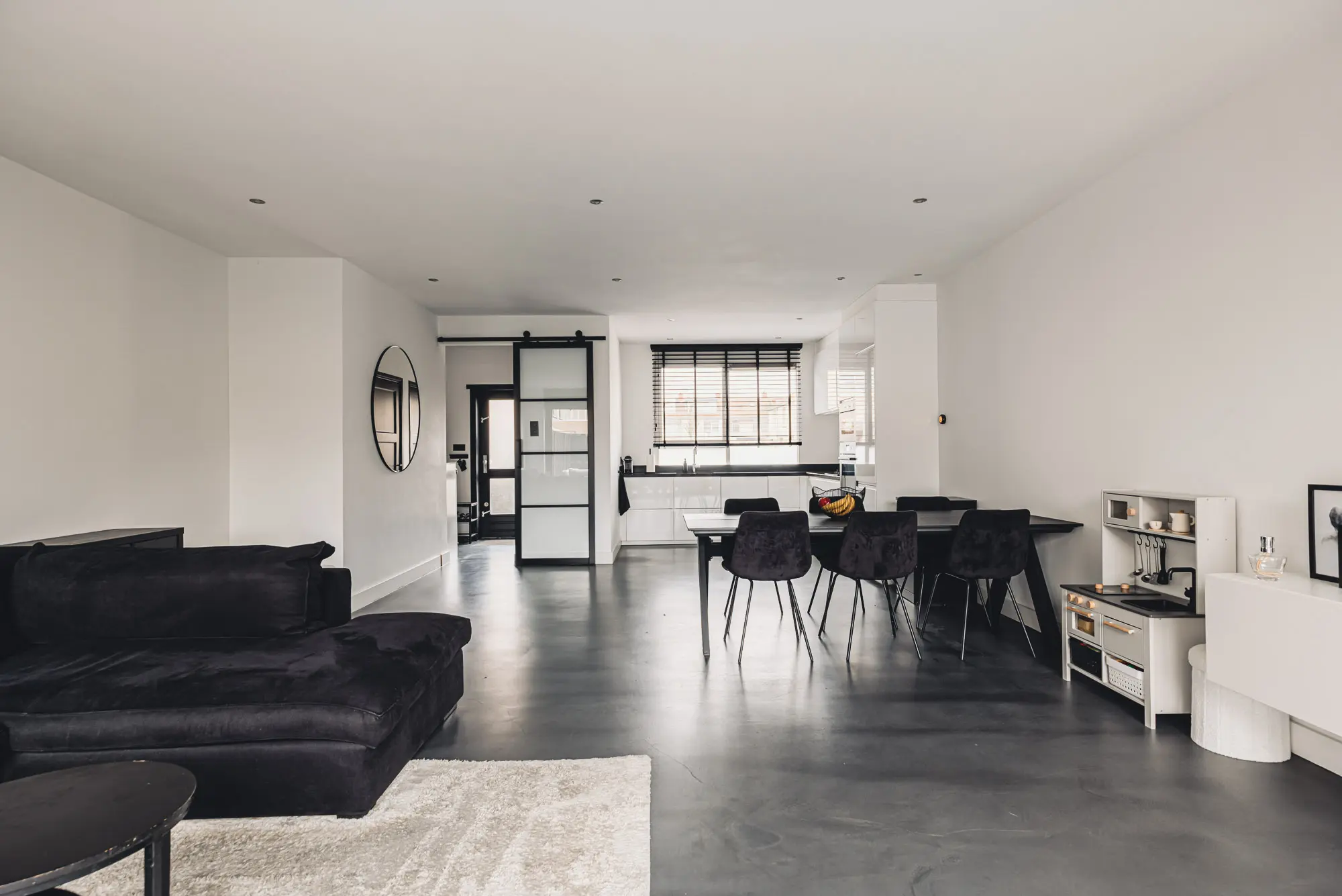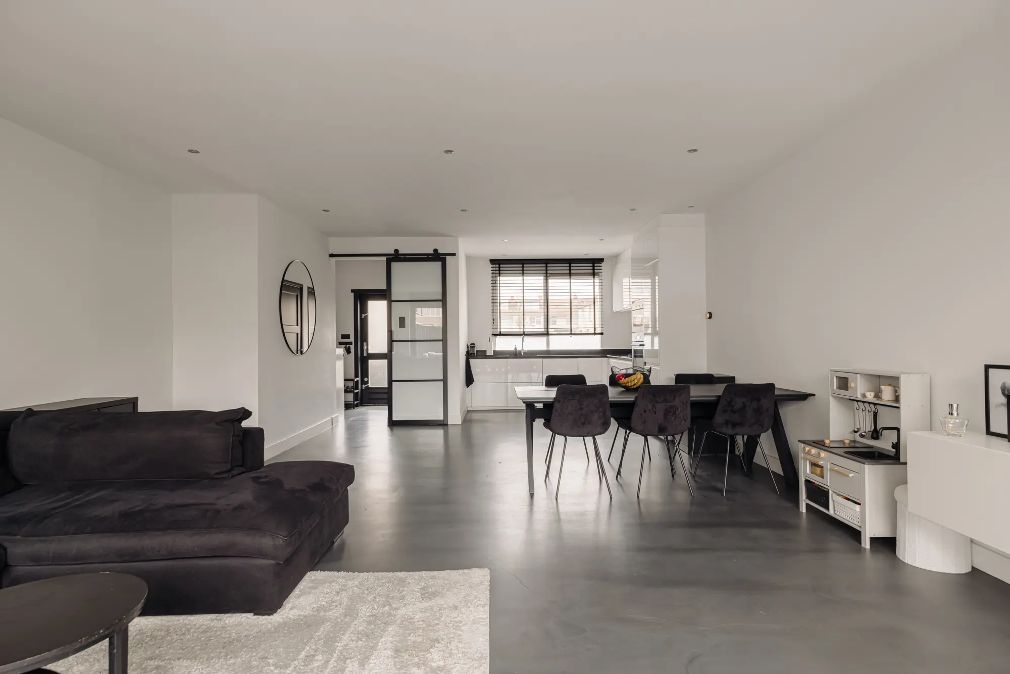 Begane grond: Voortuin van 5,52 m x 2,70 m, entree, toiletruimte, meterkast en trapopgang naar de verdieping. Woonkamer met moderne open keuken (2019), voorzien van alle inbouwapparatuur, vloerverwarming en een dubbele schuifpui naar de zonnige tuin op het westen (6,63 m diep en 6,06 m breed).