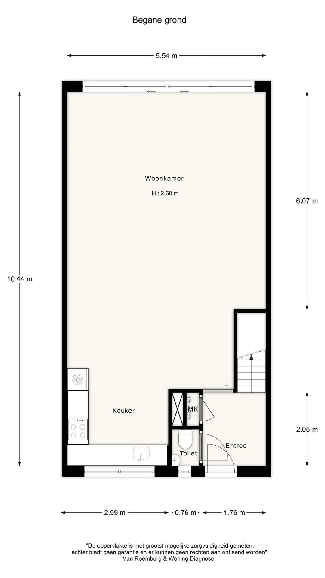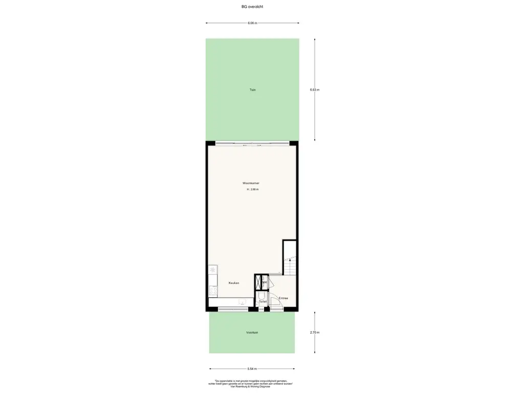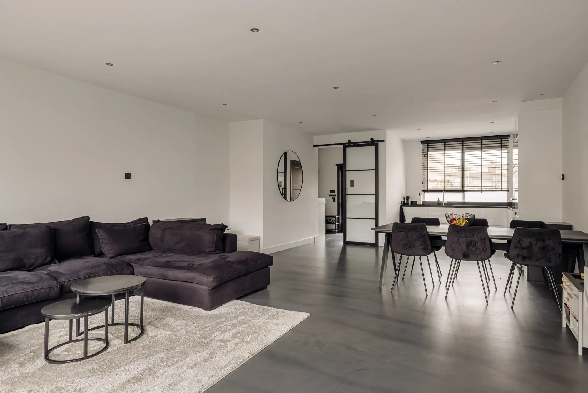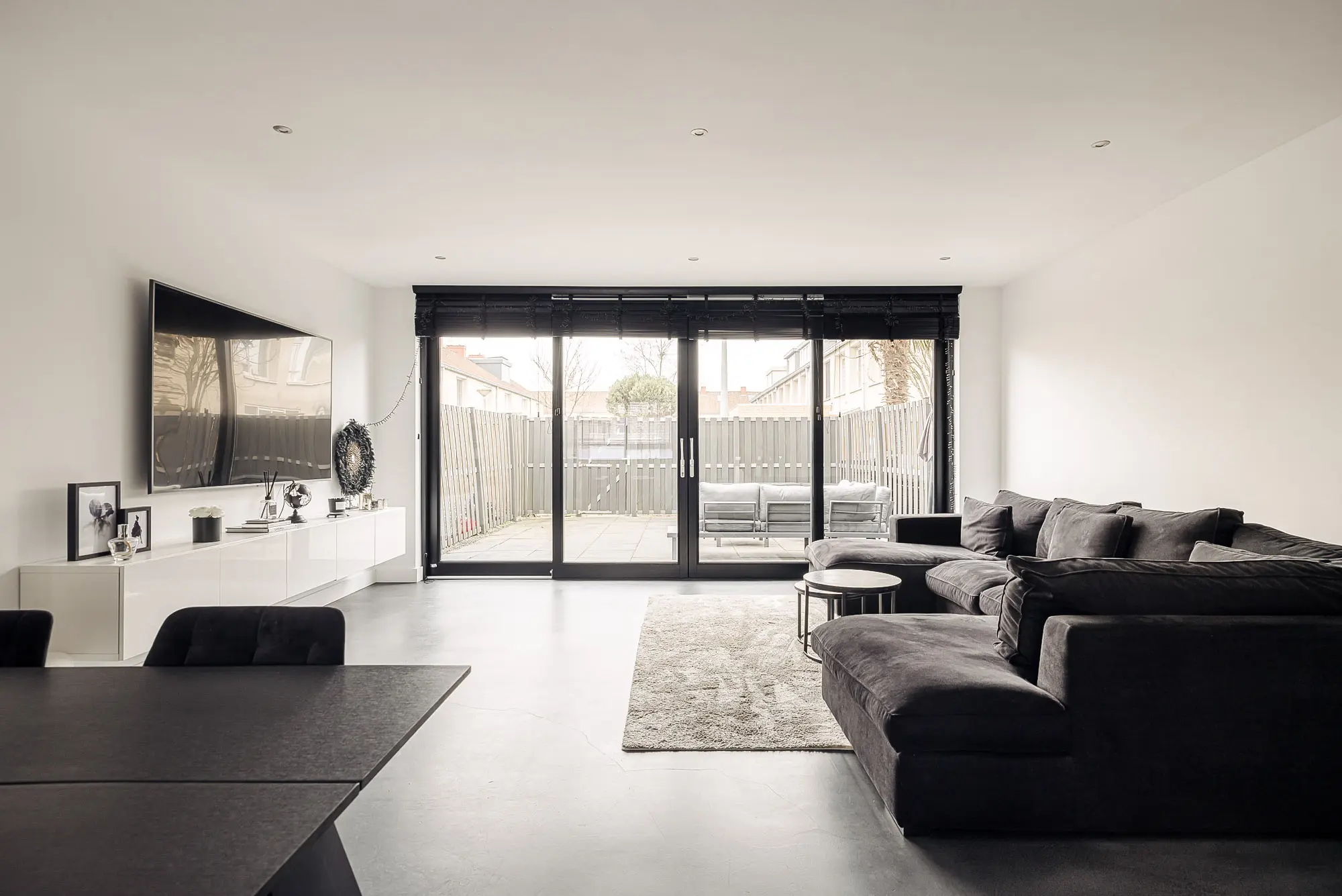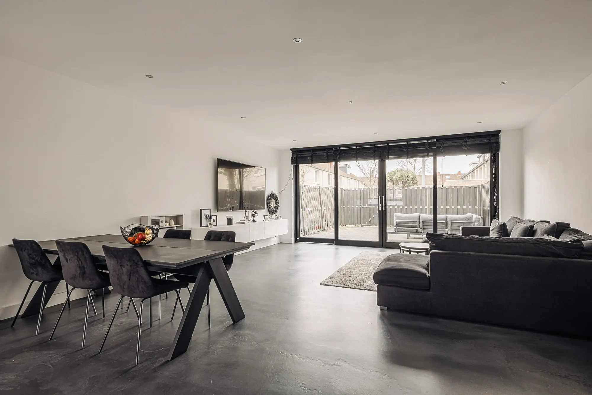 Begane grond: Voortuin van 5,52 m x 2,70 m, entree, toiletruimte, meterkast en trapopgang naar de verdieping. Woonkamer met moderne open keuken (2019), voorzien van alle inbouwapparatuur, vloerverwarming en een dubbele schuifpui naar de zonnige tuin op het westen (6,63 m diep en 6,06 m breed).