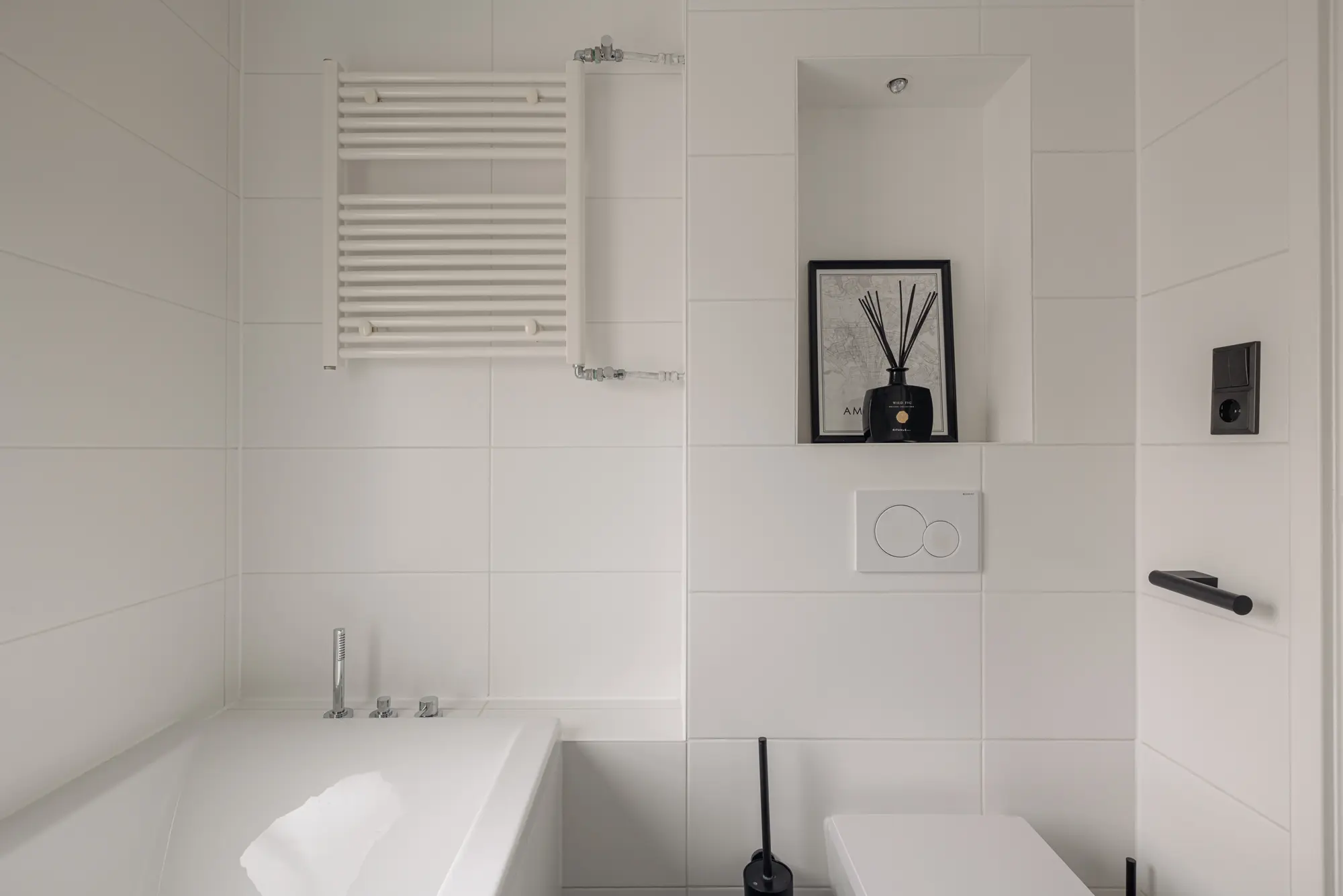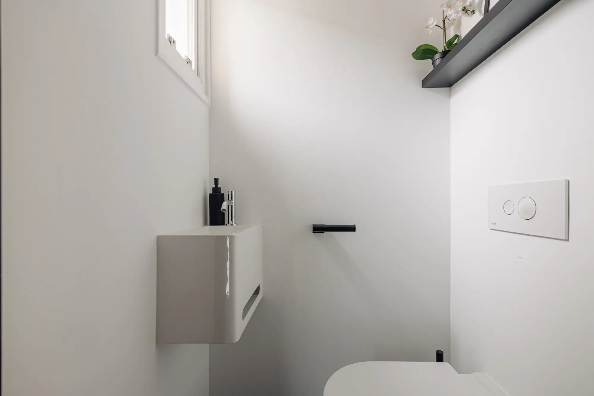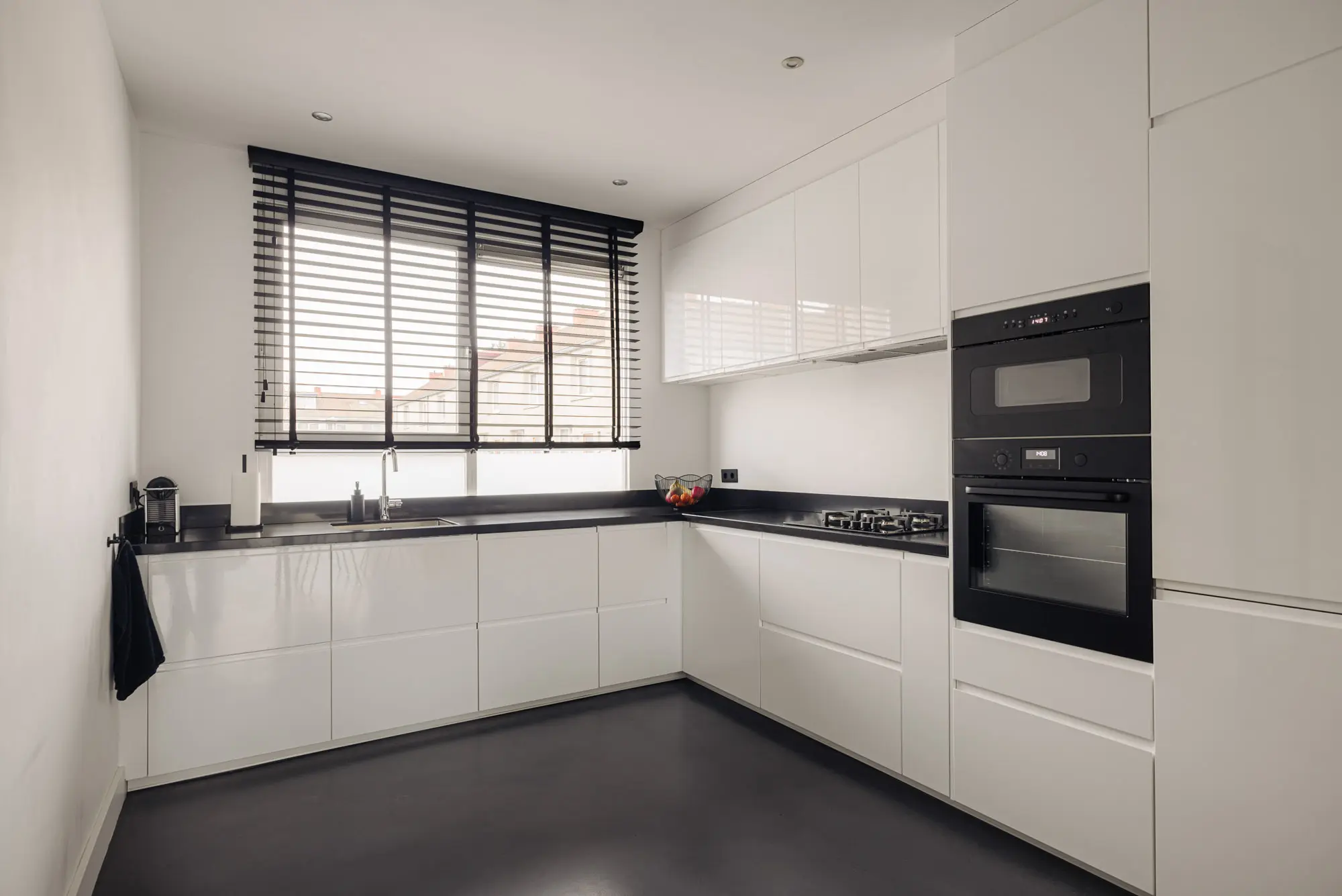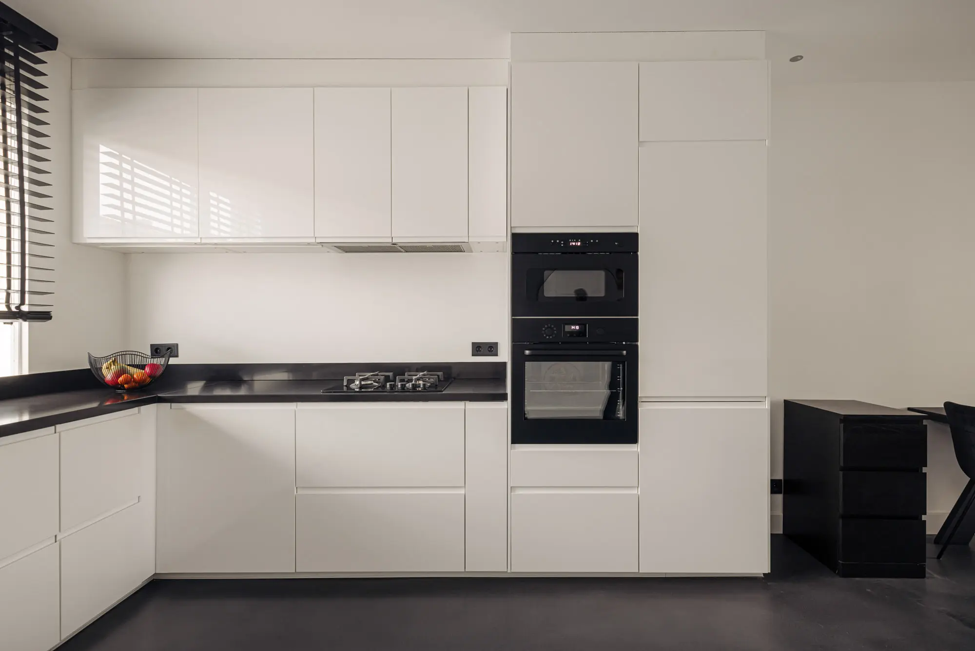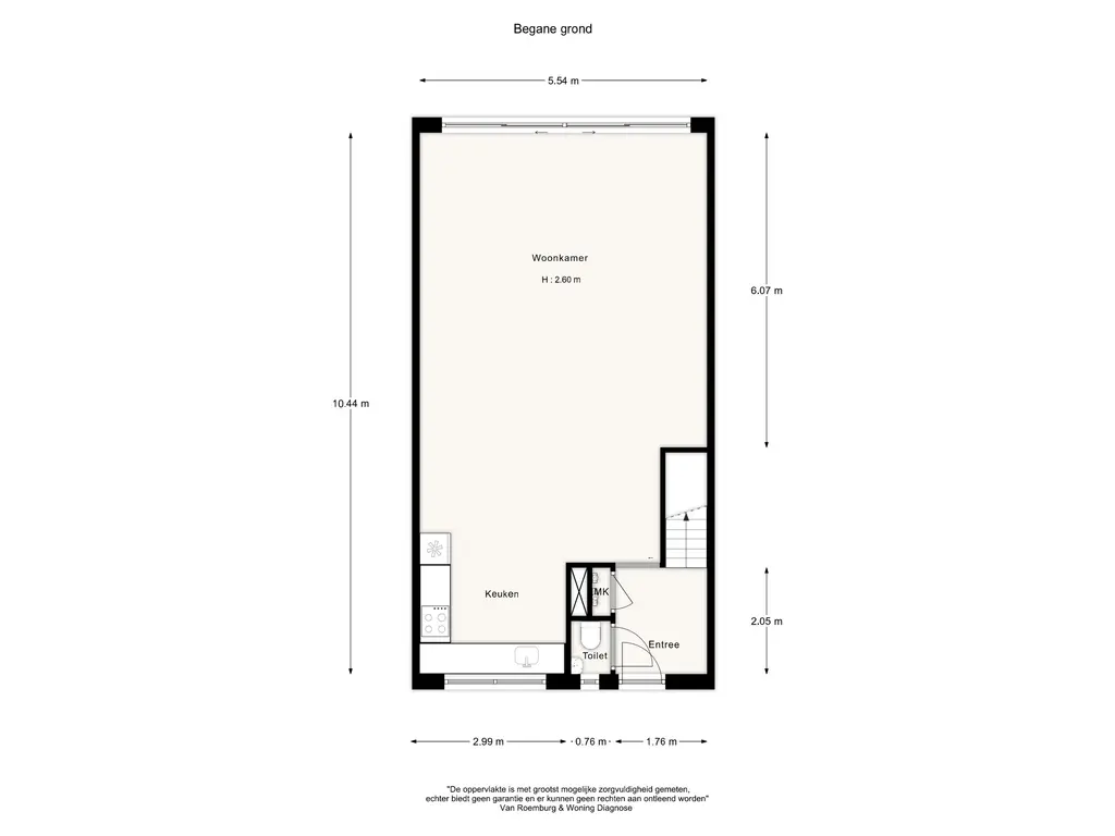 Begane grond: Voortuin van 5,52 m x 2,70 m, entree, toiletruimte, meterkast en trapopgang naar de verdieping. Woonkamer met moderne open keuken (2019), voorzien van alle inbouwapparatuur, vloerverwarming en een dubbele schuifpui naar de zonnige tuin op het westen (6,63 m diep en 6,06 m breed).