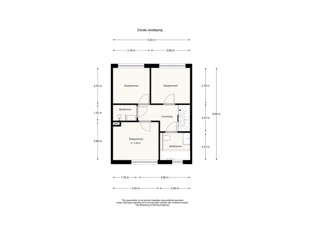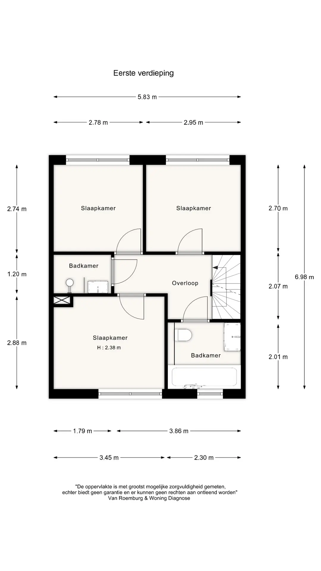 Eerste verdieping: De overloop geeft toegang tot alle vertrekken. Op deze verdieping bevinden zich drie slaapkamers en twee moderne badkamers: één met douche en wastafelmeubel, en één met ligbad, toilet en wastafelmeubel.
